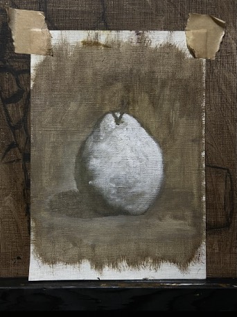 とは言ってもこの名前は絵の具の薄い塗膜の意味で、この作業 では画面一面にその層を施すというわけです。なぜこのような作業をするかというと、光の色、影の色と二つの色から形を取ることができ描きやすくなるからです。