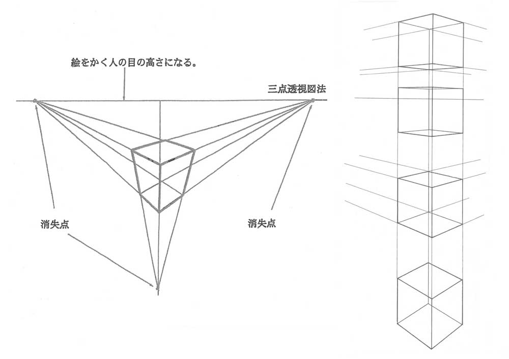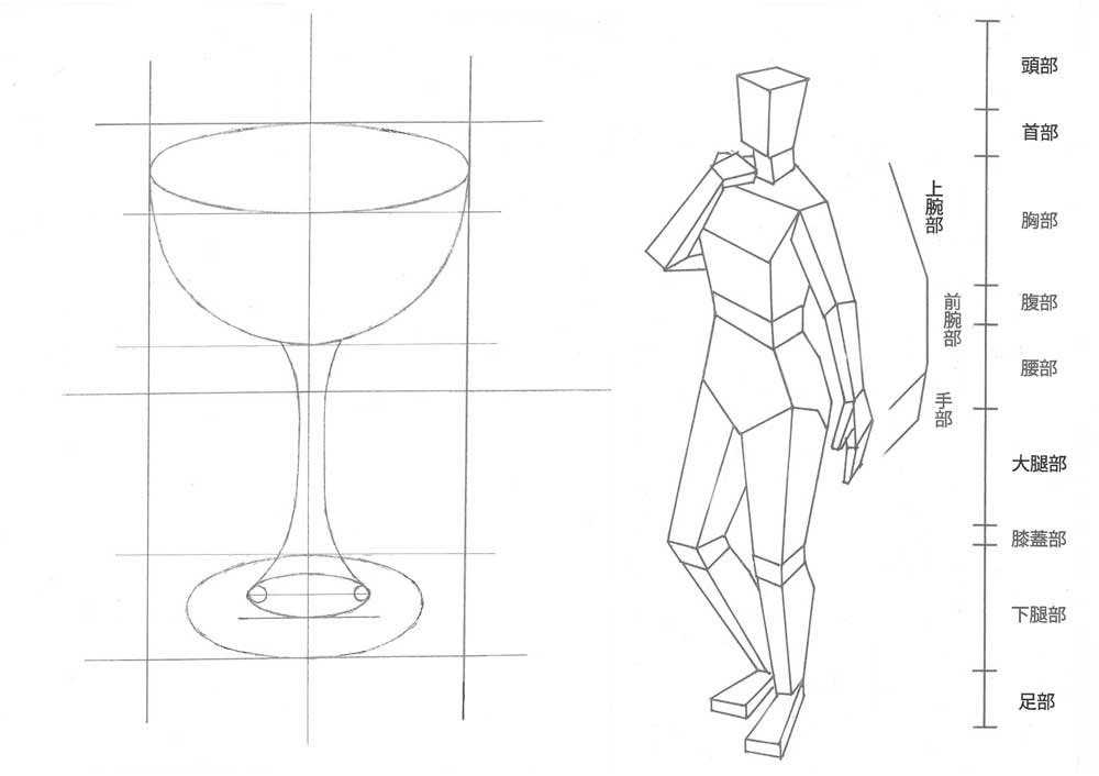 (造形基礎人体美術解剖、人体BOX形態、プロポーション概念、レンズパース(アオリ・フカン 3点透視図法) - サンプル参照、人体BOXドローイングワーク