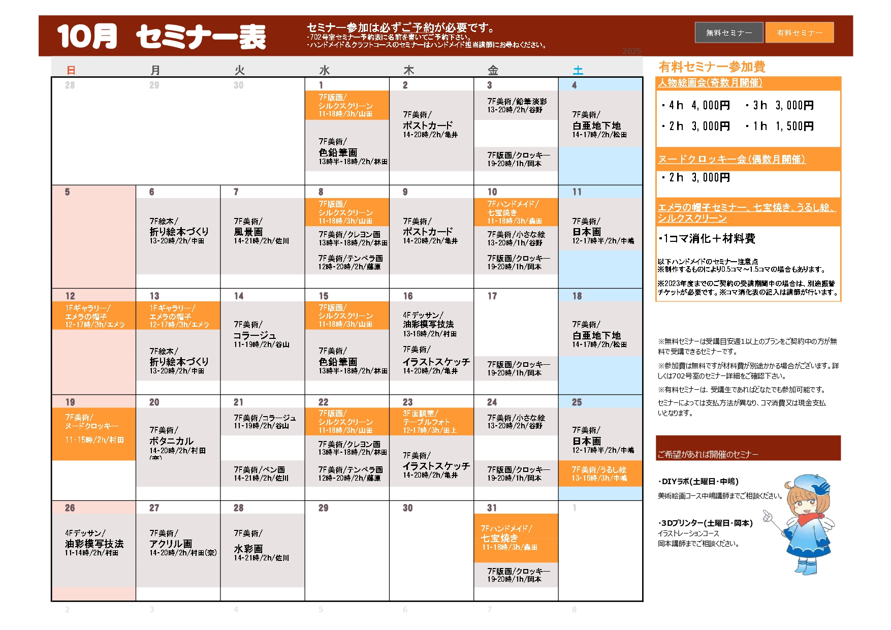2025年10月のハンドメイド&クラフトコースカレンダー