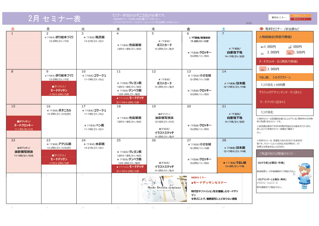 アートスクールが毎月開講しているセミナー予定表です。