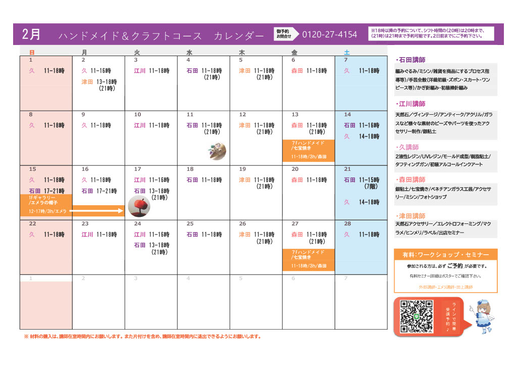 - ・ハンドメイド&クラフトコースのセミナーにつきましては、担当のハンドメイド講師へ直接ご予約いただきますようお願いいたします。参加には、コマ消費⁺別途材料費が必要となります。